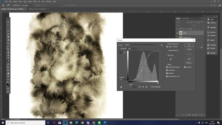 เปิดเครื่องมือประเภทที่ใช้ปรับค่าความเปรียบต่าง (Contrast) โดยในโปรแกรม Photoshop เลือกเครื่องมือ Curve โดยให้ทำการปรับค่าความเปรียบต่างของรอยพู่กันให้จัดขึ้น เนื้อกระดาษต้องกลายเป็นสีขาวจัด และสีดำก็เข้มยิ่งขึ้น เพื่อให้ร่องรอยของพู่กันมีความคมชัดเหมาะแก่การใช้งาน