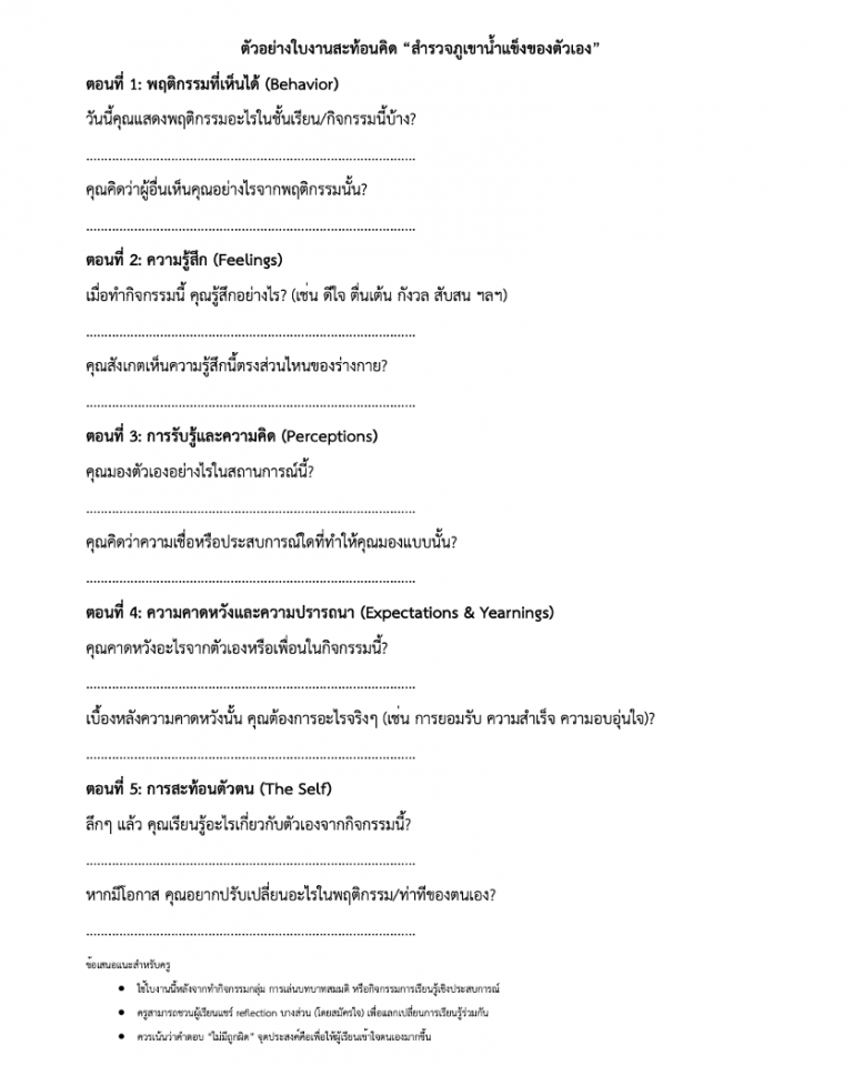 ใช้คำถามเชิงกระบวนการ เพื่อให้นักเรียนได้สำรวจพฤติกรรม ความรู้สึก ความคิด และคุณค่าในตนเอง เช่น “คุณเรียนรู้อะไรจากกิจกรรมนี้?” “ความรู้สึกนี้สะท้อนอะไรเกี่ยวกับเป้าหมายของคุณ?”