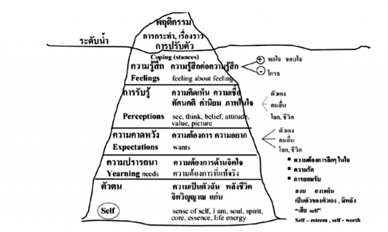 ซาเทียร์เปรียบเทียบจิตใจของมนุษย์เหมือนภูเขาน้ำแข็ง โดยส่วนที่มองเห็นได้เหนือผิวน้ำมีเพียงเล็กน้อย แต่ส่วนที่ใหญ่กว่าและเป็นพลังขับเคลื่อนที่แท้จริงนั้นอยู่ใต้ผิวน้ำ องค์ประกอบของภูเขาน้ำแข็งประกอบด้วยระดับต่างๆ ดังนี้