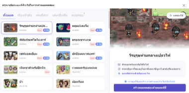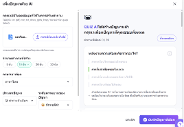 7. สามารถให้ AI ช่วยสร้างข้อคำถามจากการเล่นเกมได้ โดยการอัปโหลดเอกสารในรูปแบบไฟล์ต่างๆ ขนาดไม่เกิน 30 MB แล้วเลือกจำนวนคำถามที่ต้องการสร้าง เลือกภาษาที่ต้องการ ประเภทของคำถาม (แบบตัวเลือก, แบบตอบสั้น และแบบถูกผิด) และระดับความยาก ต่อมาผู้สอนเลือกว่าข้อคำถามไหนเป็นข้อที่สามารถใช้งานได้ ให้ทำเครื่องหมายถูกเลือกข้อที่ต้องการ แล้วเลือกบันทึกปัญหาที่เลือก