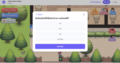 - เมื่อผู้เรียนเข้าสู่ระบบฯ โปรแกรมจะเปิดแผนที่ให้ผู้เรียนเข้าไปเรียนรู้ ผู้เรียนสามารถเปิดเอกสารการเรียนรู้เพื่ออ่านก่อนไปทำแบบทดสอบผ่านการเล่นเกมได้